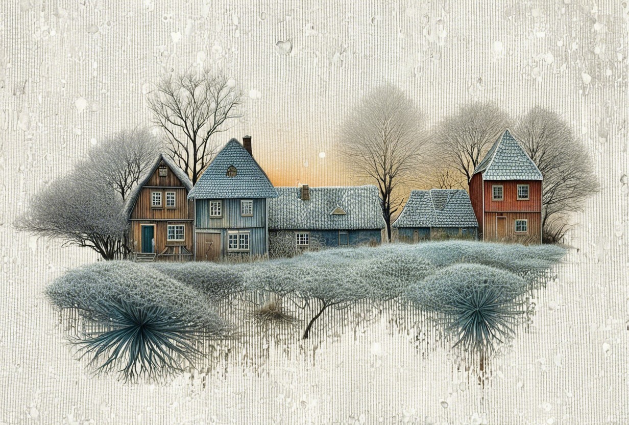 A serene winter scene features quaint houses surrounded by frosty trees and bushes. The pastel sky hints at dawn, creating a peaceful, enchanting atmosphere in a snowy landscape.