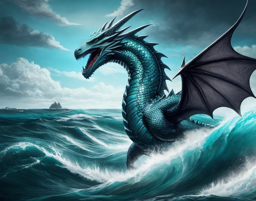 Blue Dragon Emerges from Stormy Ocean Waves with Spread Wings