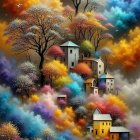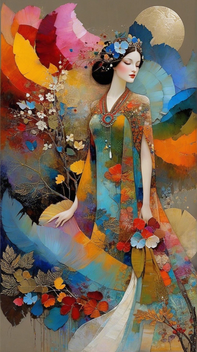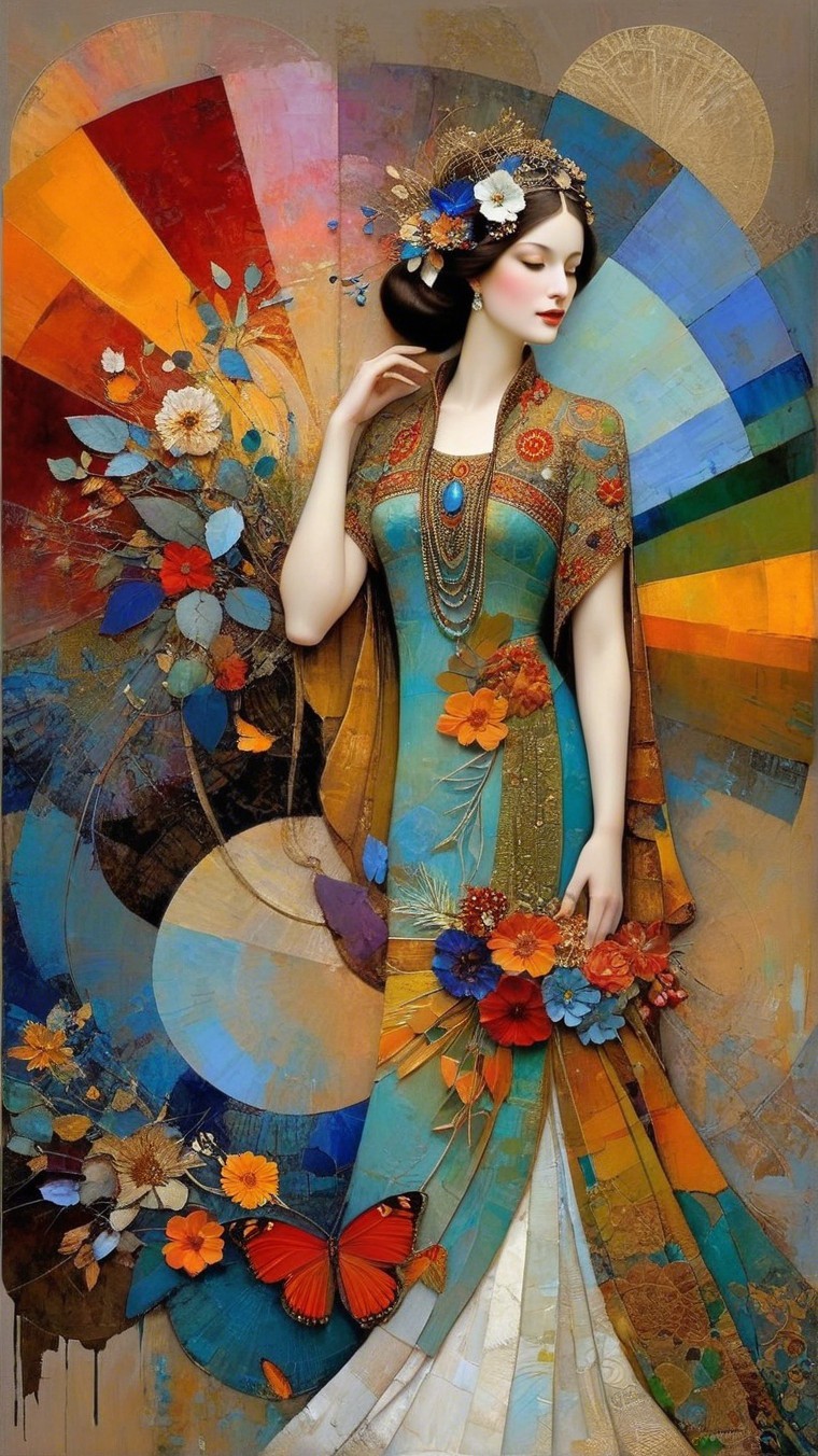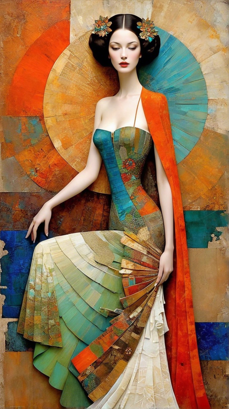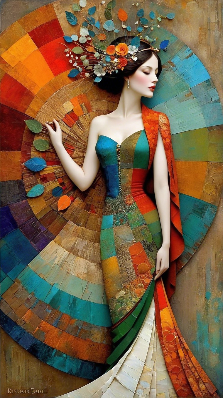 A woman in a vibrant, flowing gown featuring shades of green and orange, adorned with leaves. Her hair is styled elegantly, accented by a white flower, against a colorful, textured backdrop.