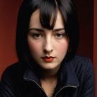 A futuristic scene features a young woman with sleek dark hair and a high-tech jacket, set against a vibrant cityscape illuminated by neon signs and shadows of onlookers.