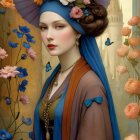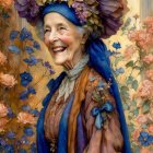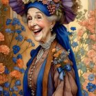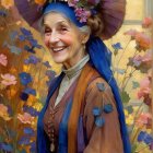 A smiling elderly woman in a colorful, elegant dress stands amidst blooming flowers. Her head is adorned with a wide-brimmed hat, exuding a warm, joyful presence in a serene landscape.