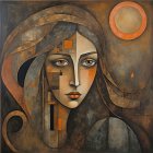 A striking portrait of a woman with a geometric face featuring shades of brown and orange. Her expressive eyes and flowing hair contrast with the abstract design and a large circular sun in the background.