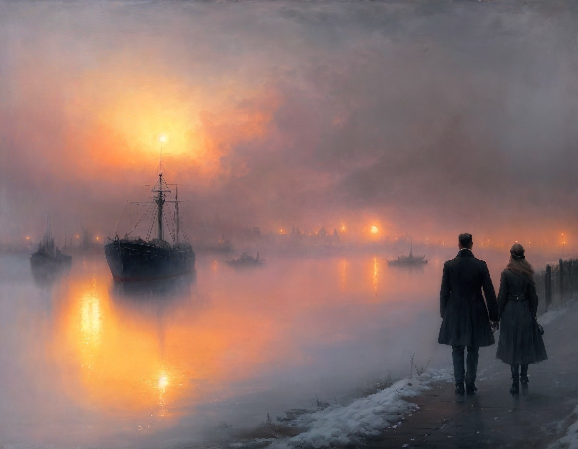 Misty Riverside Scene at Dawn with Silhouetted Figures