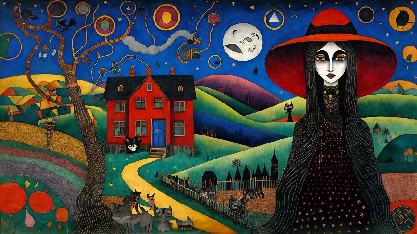 A mysterious woman in a wide-brimmed red hat stands beside a colorful autumn landscape, featuring a red house and a winding path. Night falls, illuminated by a glowing moon and stars. Cats accompany her.