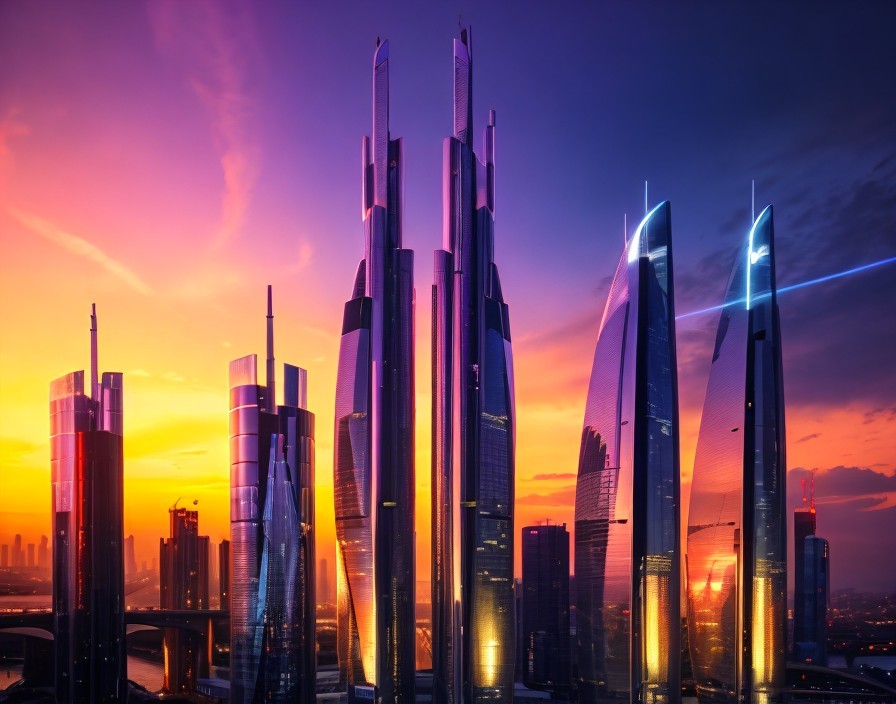 City skyline at sunset: Skyscrapers in orange and purple hues