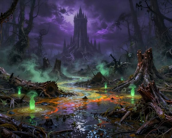 A vibrant oasis emerges in a desolate landscape. Metallic plants, shimmering oil ponds, and glass flowers. The scene blends art nouveau elements with rusty metal textures, wire roots, and a unique palette of metallic hues under a dramatic sunset