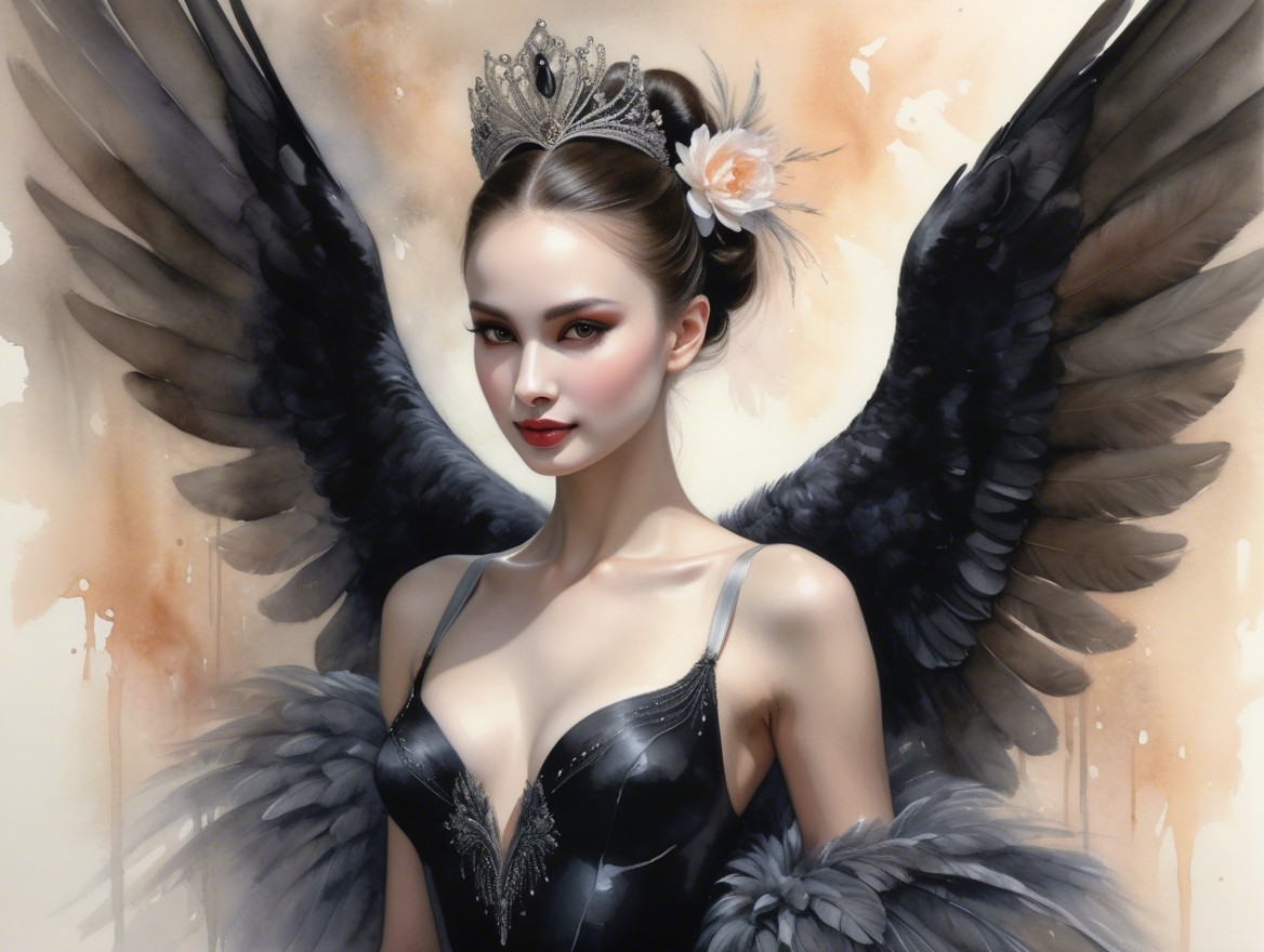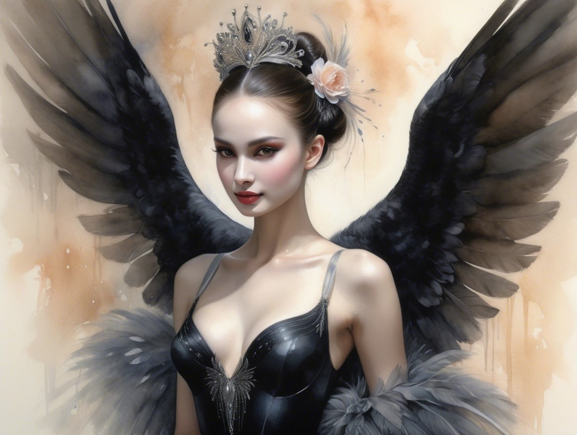 A stunning figure with black feathered wings, wearing a sleek black outfit. Her elegant hair is adorned with a flower and a tiara, conveying a mystical and dramatic aura.