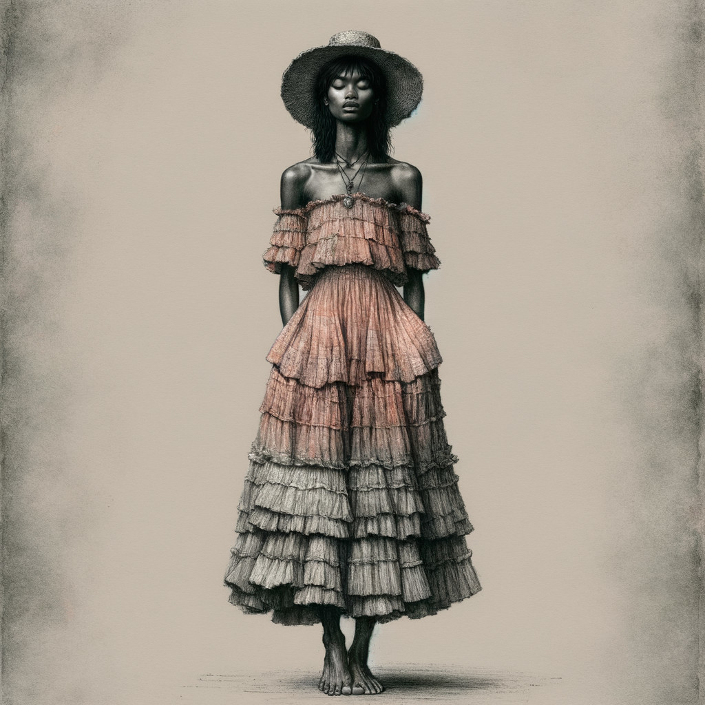 An artwork depicting a girl in a vintage dress and hat, with a surreal, eerie ambiance.
