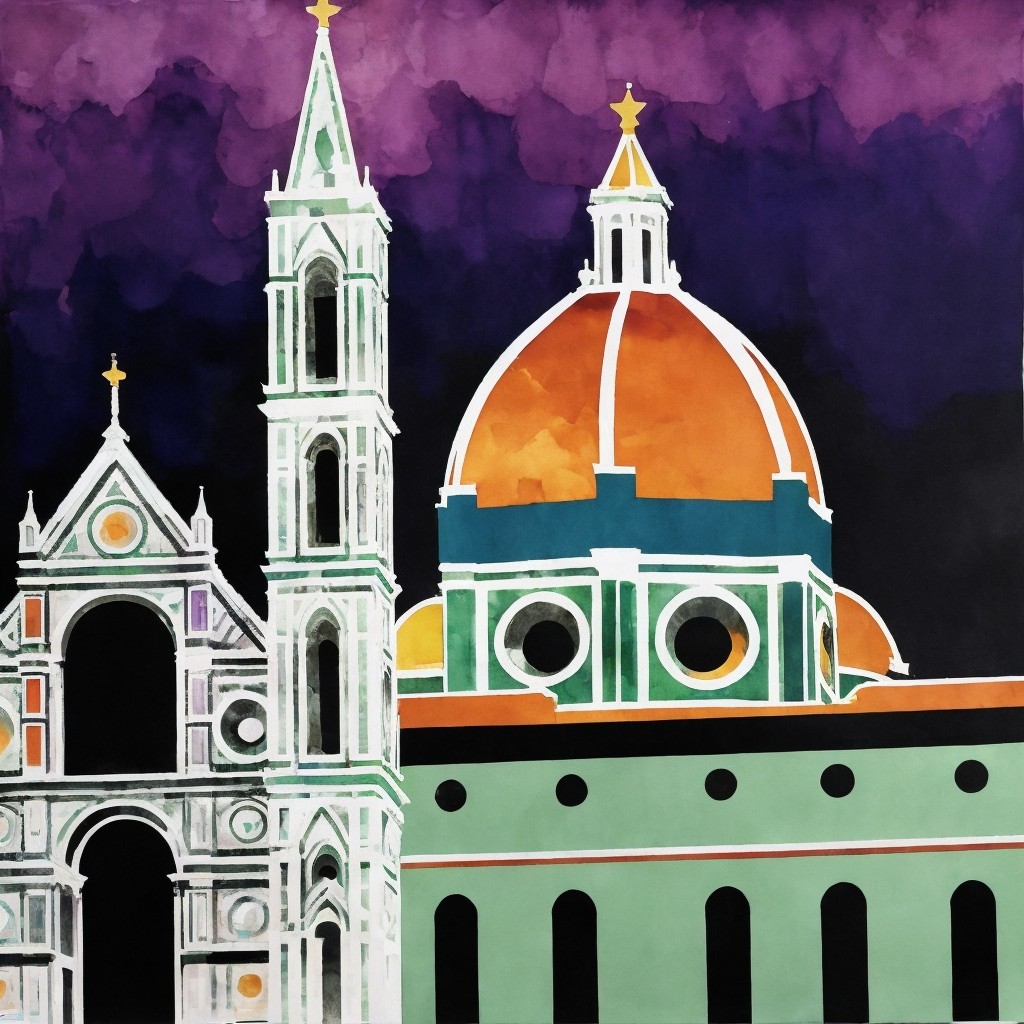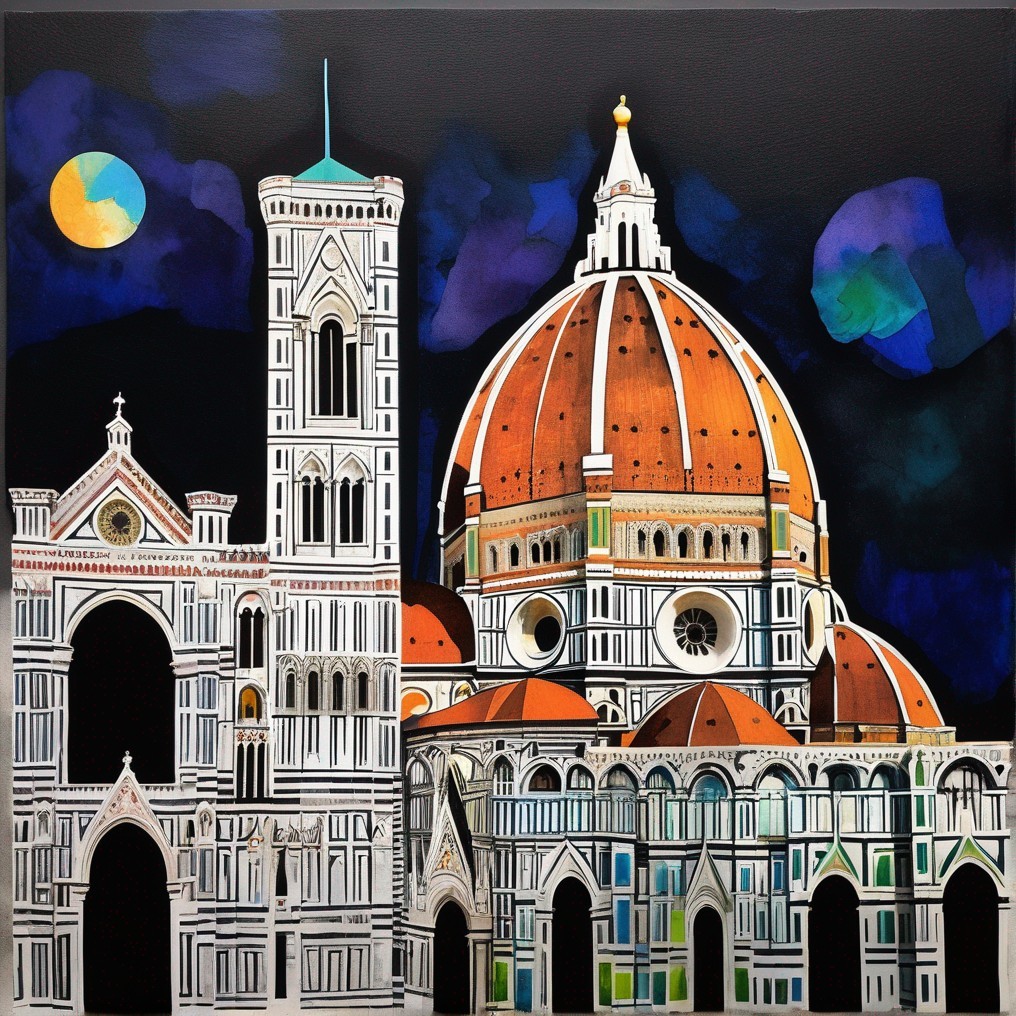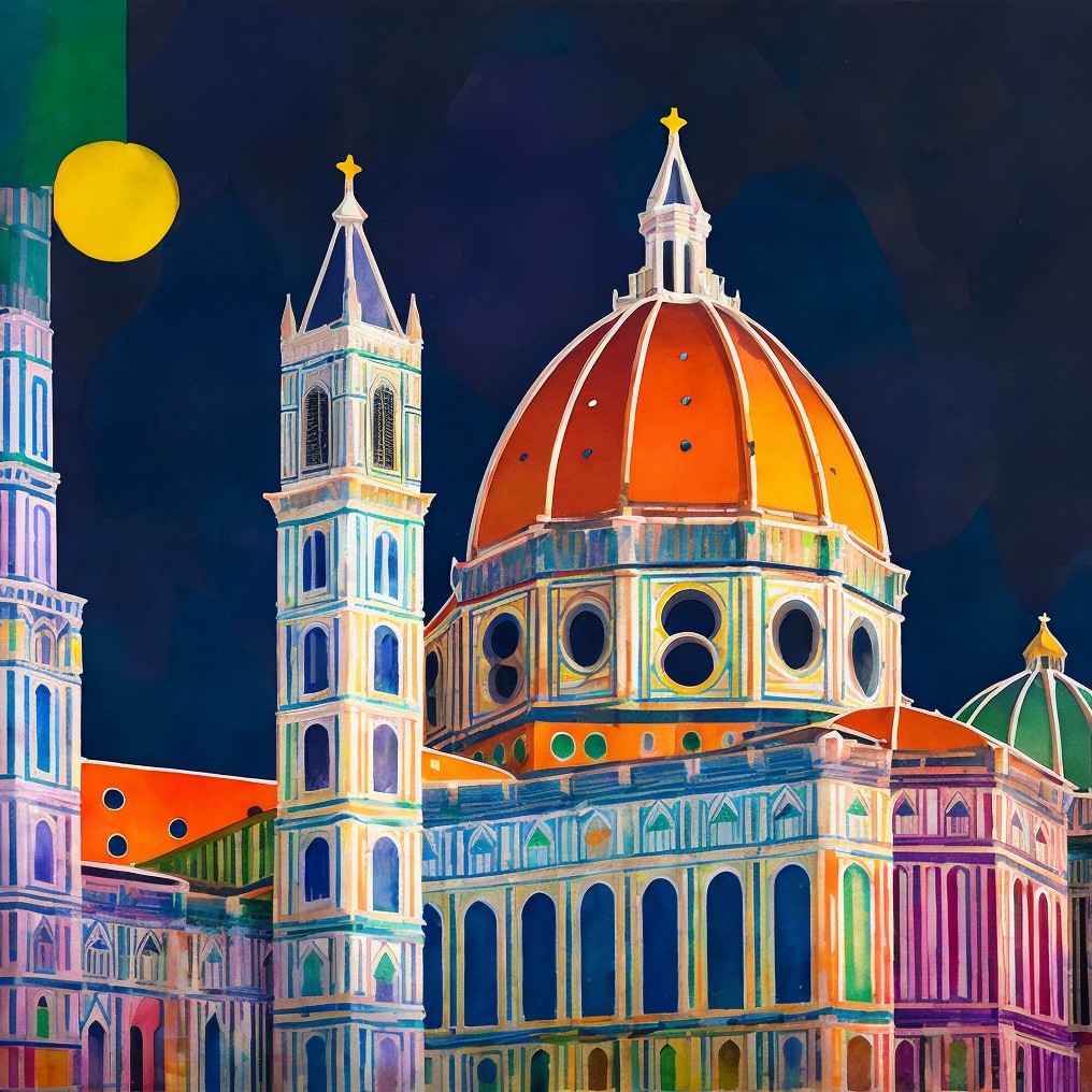 A vibrant painting of Florence's Duomo under a golden sun, with colorful buildings in the foreground and a deep blue sky.