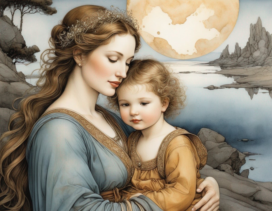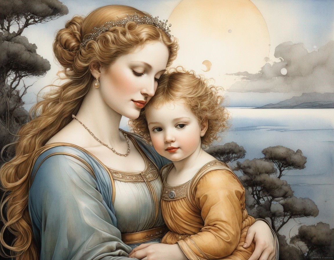 A tender illustration of a mother embracing her child, both with serene expressions, set against a soft, cloudy backdrop with a pale sun.