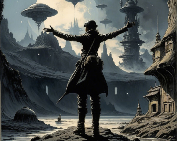 A woman rides a majestic black horse, soaring through a surreal landscape. She wields a colorful bow, illuminated by a mystical light, creating a striking contrast with the dark ocean below.