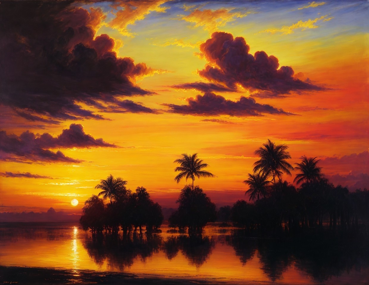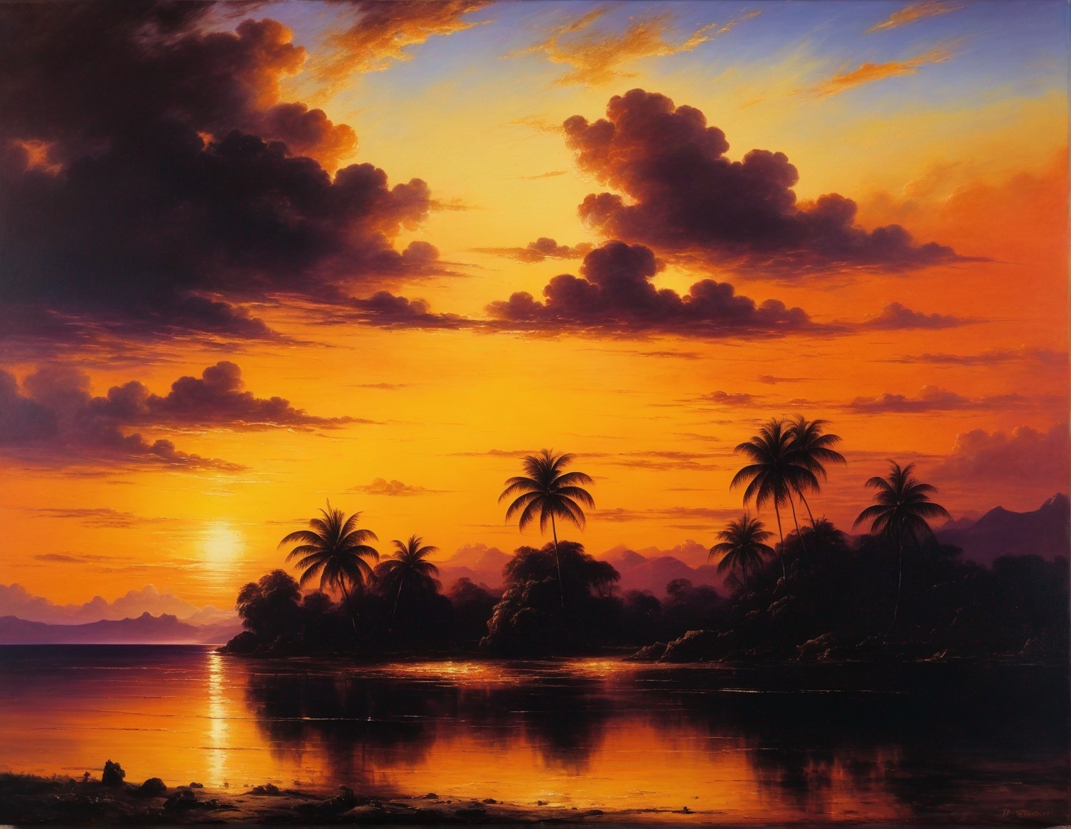Prompt: Oil on canvas, wide angle landscape view, a magnificent sunset at Tahiti. Glowing with vibrant hues, glowing with vibrant hues, sky transitioning from warm orange to deep purple. Perfect composition. By Peter Paul Rubens. William Turner.