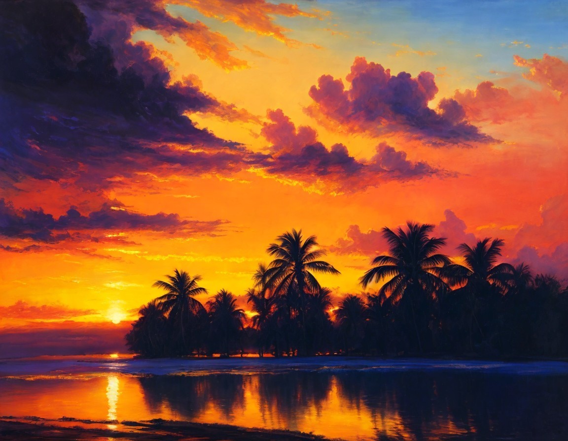 Prompt: "Oil on canvas, wide angle landscape view, a magnificent sunset at Tahiti. Glowing with vibrant hues, glowing with vibrant hues, sky transitioning from warm orange to deep purple. Perfect composition. By Peter Paul Rubens. William Turner."