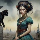 A beautifully adorned woman in teal attire, adorned with intricate jewelry and a floral crown, sits gracefully beside a sleek black cat, set against an ethereal backdrop of distant castles and blooming flowers.