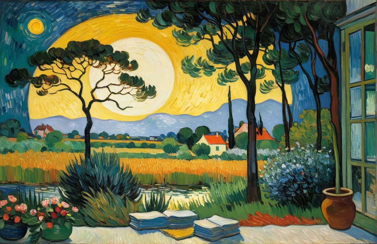 Bold, swirling skies with a large moon and stars. Lush trees frame a scene of a river, colourful flowers, and charming houses bathed in warm light.