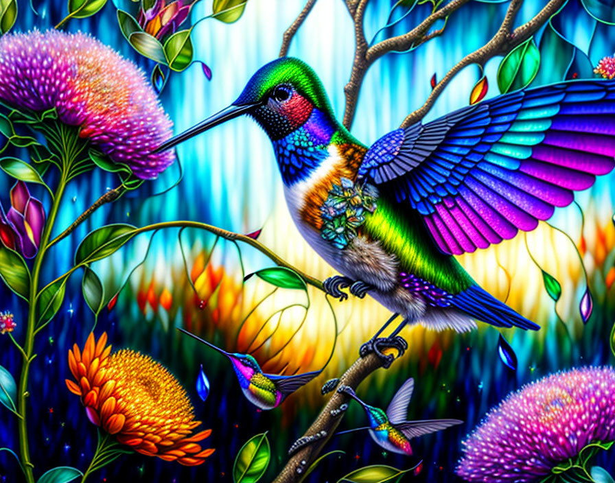 Refractive stained glass patchwork Beautiful pinwheel flowers and hummingbird flowing out over a stormy, cottony tree field. Alex Alemany collaboration with Jean Baptiste Monge.
