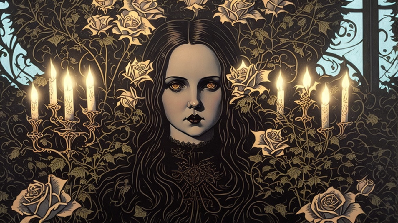 A hauntingly beautiful girl with long black hair and striking yellow eyes stands among dark roses, illuminated by glowing candles that enhance the gothic ambiance of the scene.