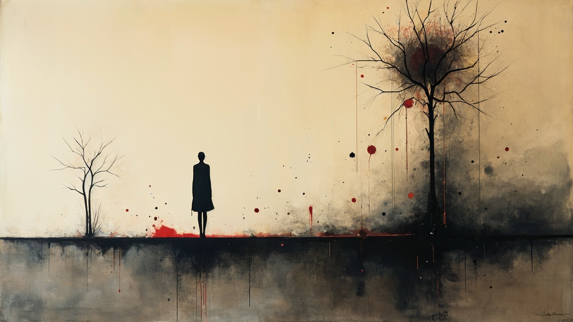 A solitary figure stands on a stark landscape, flanked by a bare tree and an abstract burst of color. The background blends warm and cool tones, creating a sense of introspection and contrast.