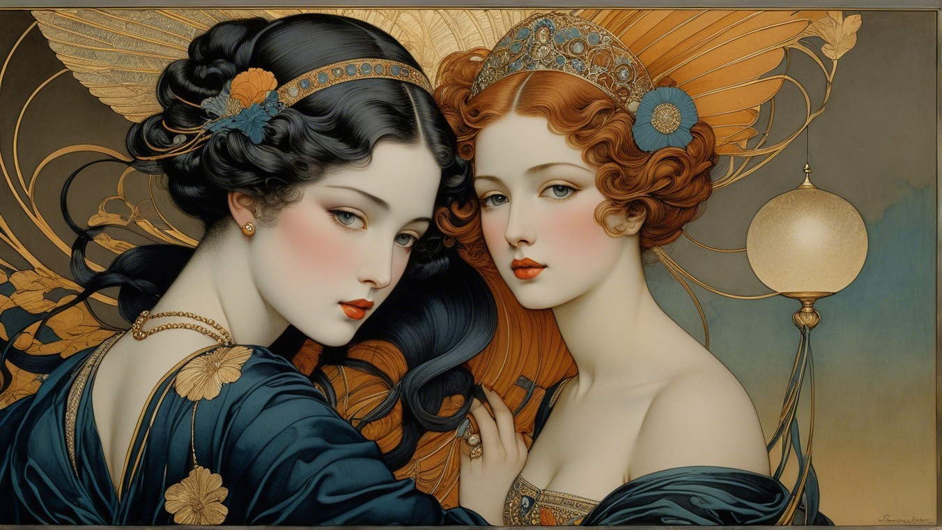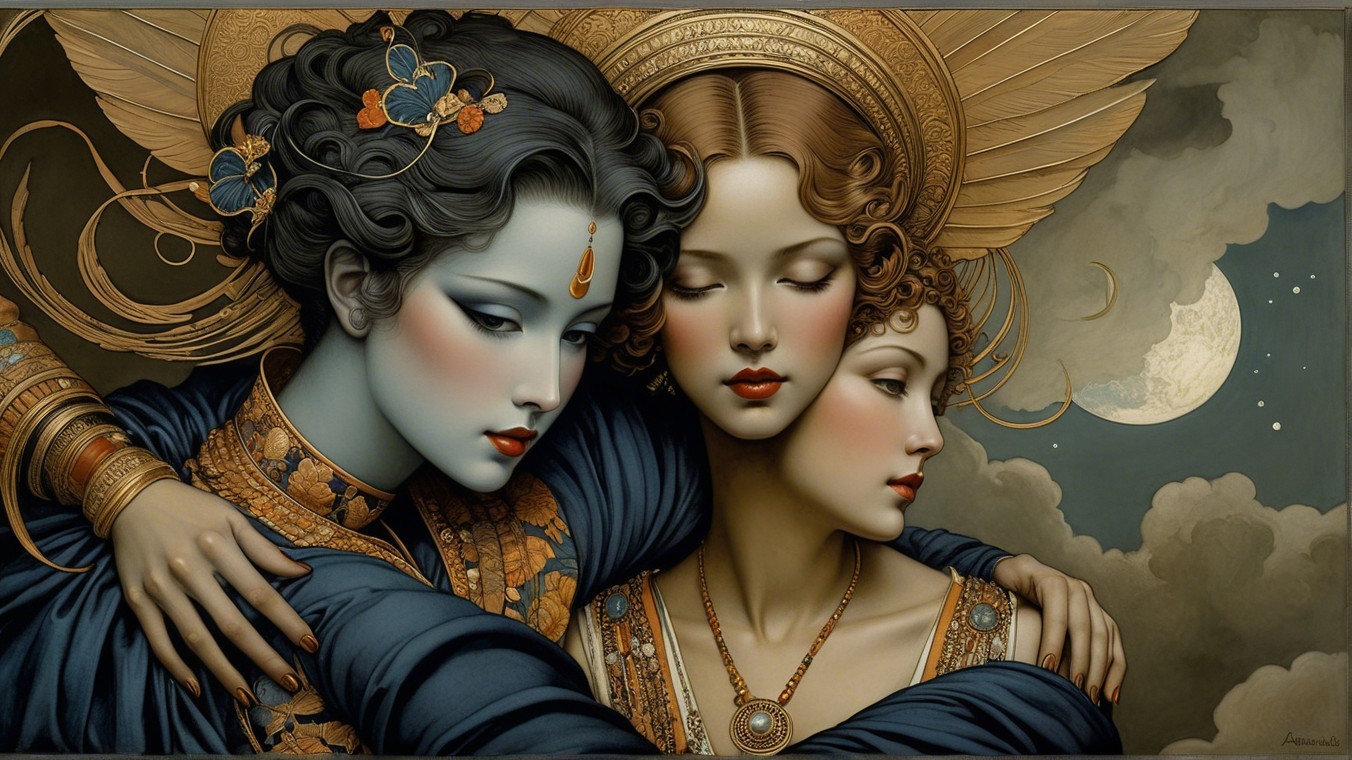 A stunning figure dressed in ornate garments holds a parasol, adorned with jewelry and floral details. The moon illuminates the night sky, complemented by a white bird nearby.