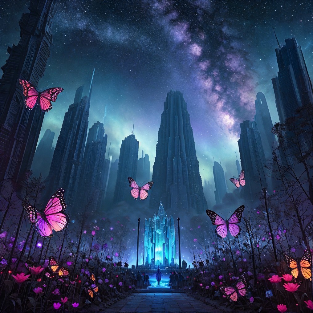 A mystical night scene with glowing butterflies, vibrant flowers, towering gothic spires, and a starry sky.