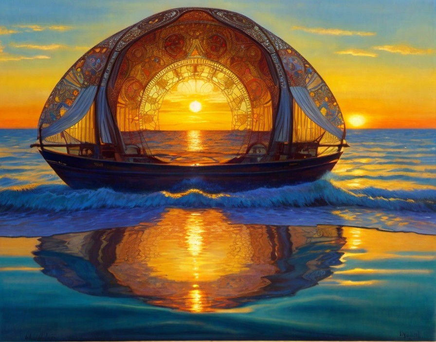 An ornate boat with stained glass sails glides on the sea at sunset, reflecting golden hues on the water.