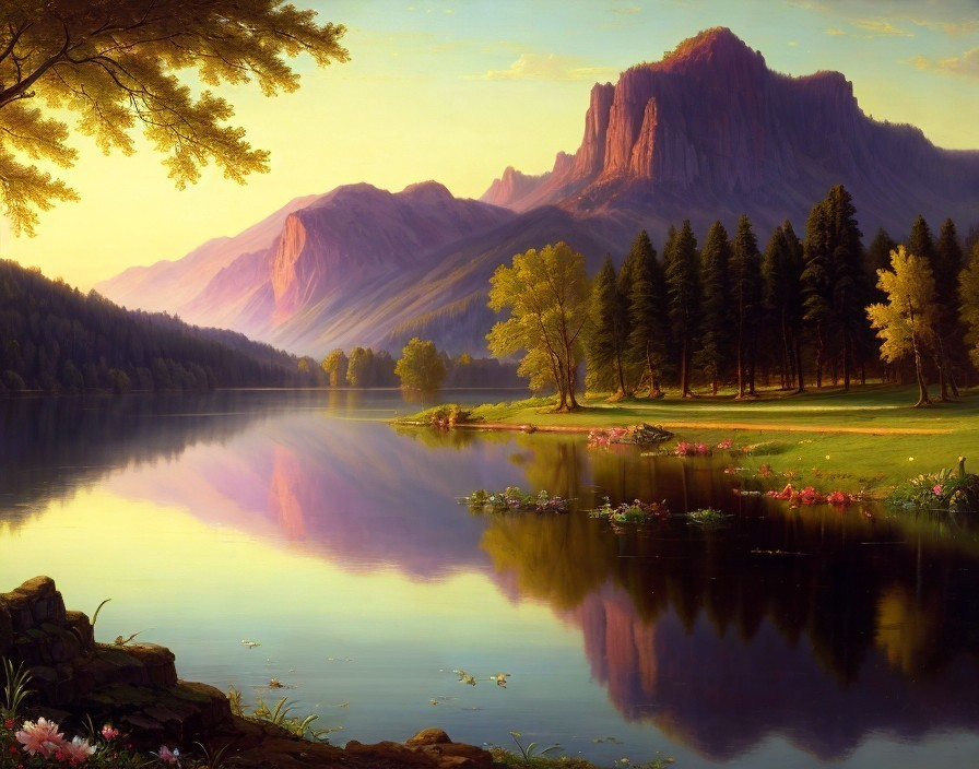 Prompt: Oil on canvas, wide angle landscape view, a colorful dawn over a lake between mountains at spring. Glowing with vibrant hues. Perfect composition. By Peter Paul Rubens William Turner. By Pierre-Auguste Cot.