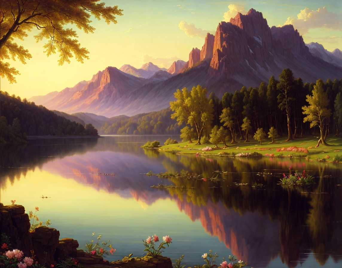Oil on canvas, wide angle landscape view, a colorful dawn over a lake between mountains at spring. Glowing with vibrant hues. Perfect composition. By Peter Paul Rubens William Turner. By Pierre-Auguste Cot.