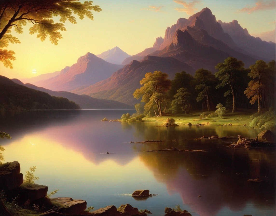 Prompt: "Oil on canvas, wide angle landscape view, a colorful dawn over a lake between mountains at spring. Perfect composition. By Asher Brown Durand. By Thomas Cole."