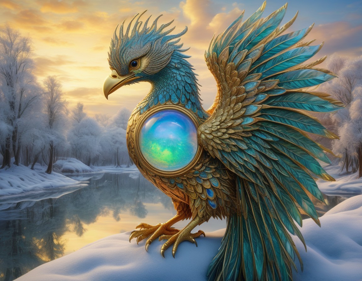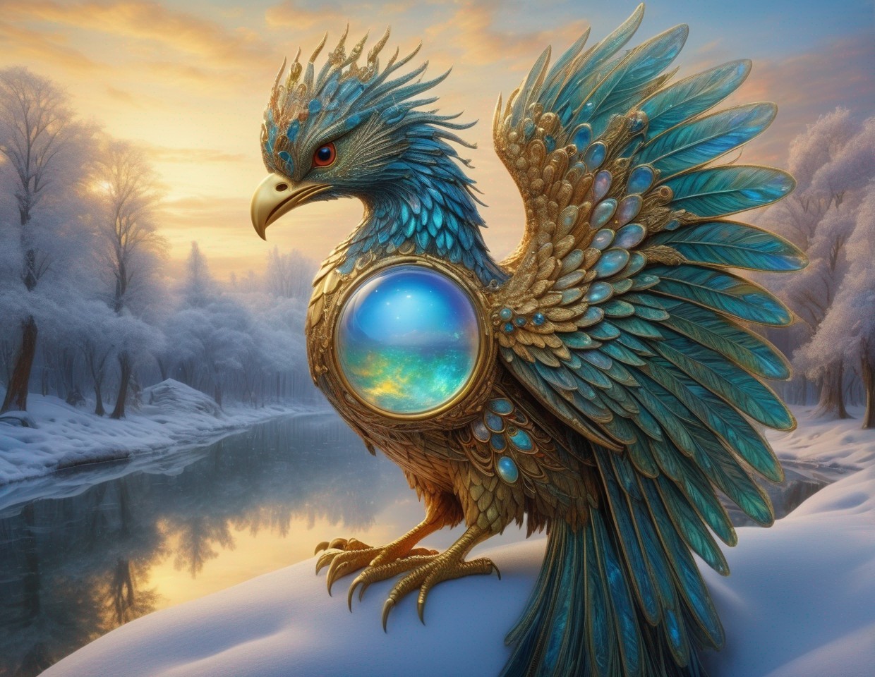 A majestic, vibrantly colored, computer-generated phoenix perches beside a wintry river, its feathers intricately detailed against a twilight scene.