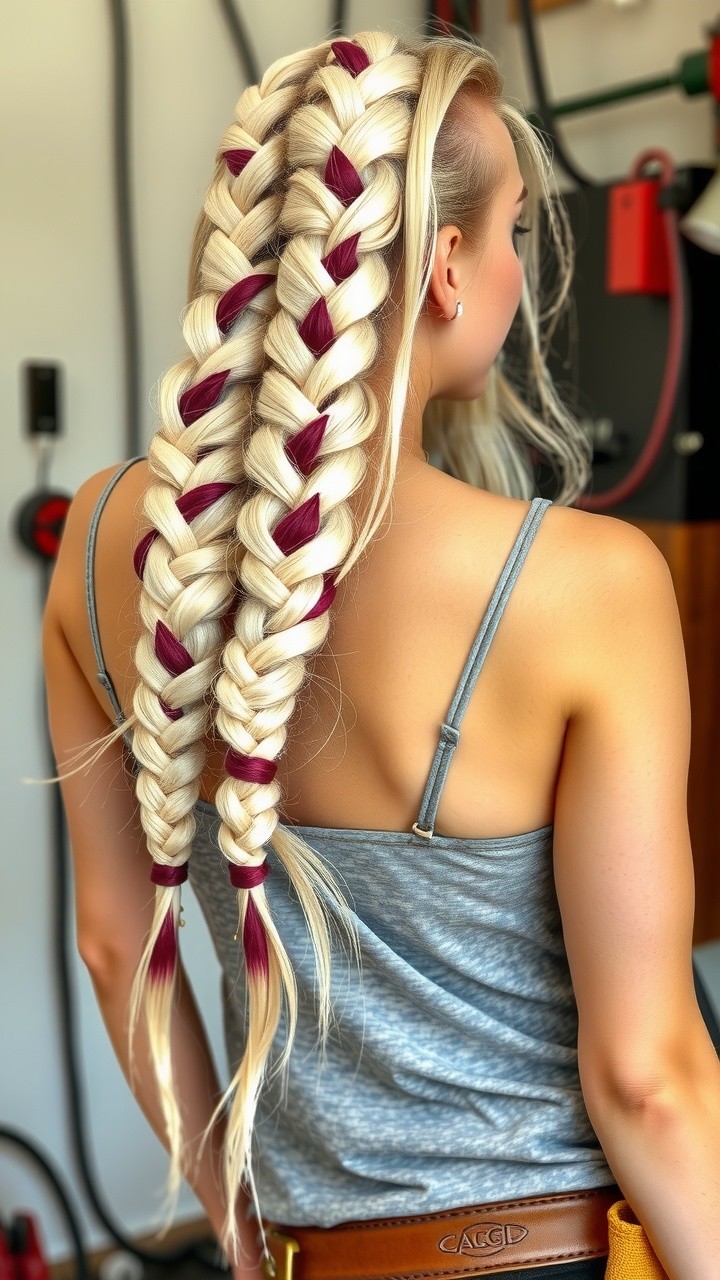 A woman with long, intricately braided hair featuring white and burgundy sections stands with her back to the camera, wearing a red top and brown pants, set against an industrial backdrop.