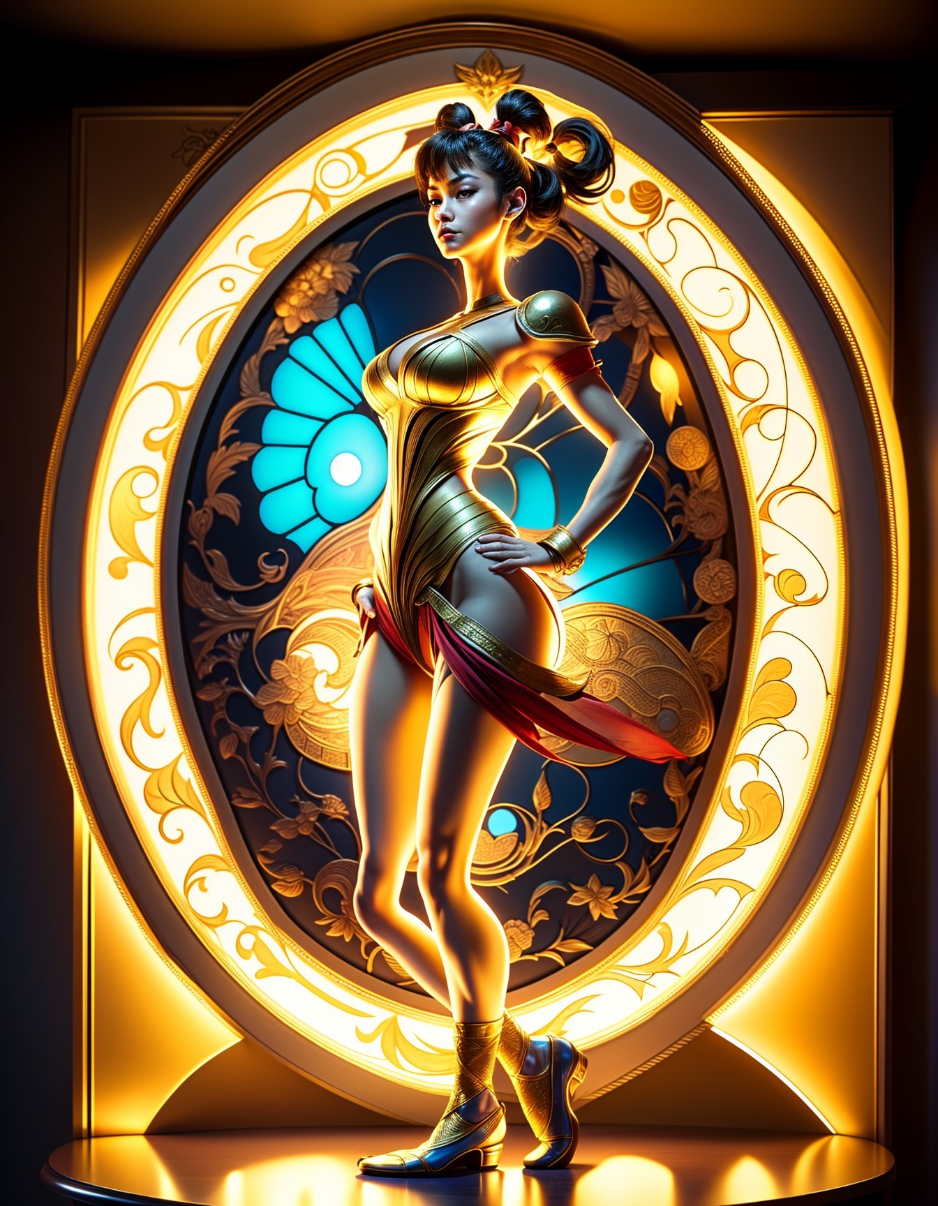 A stylized illustration of a woman in gold attire posing confidently within an ornate, glowing oval frame with elaborate designs.