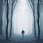 A figure walks down a misty, ethereal path flanked by tall, bare trees. The atmosphere is mysterious, with a soft, glowing light at the end of the trail, shrouded in fog.