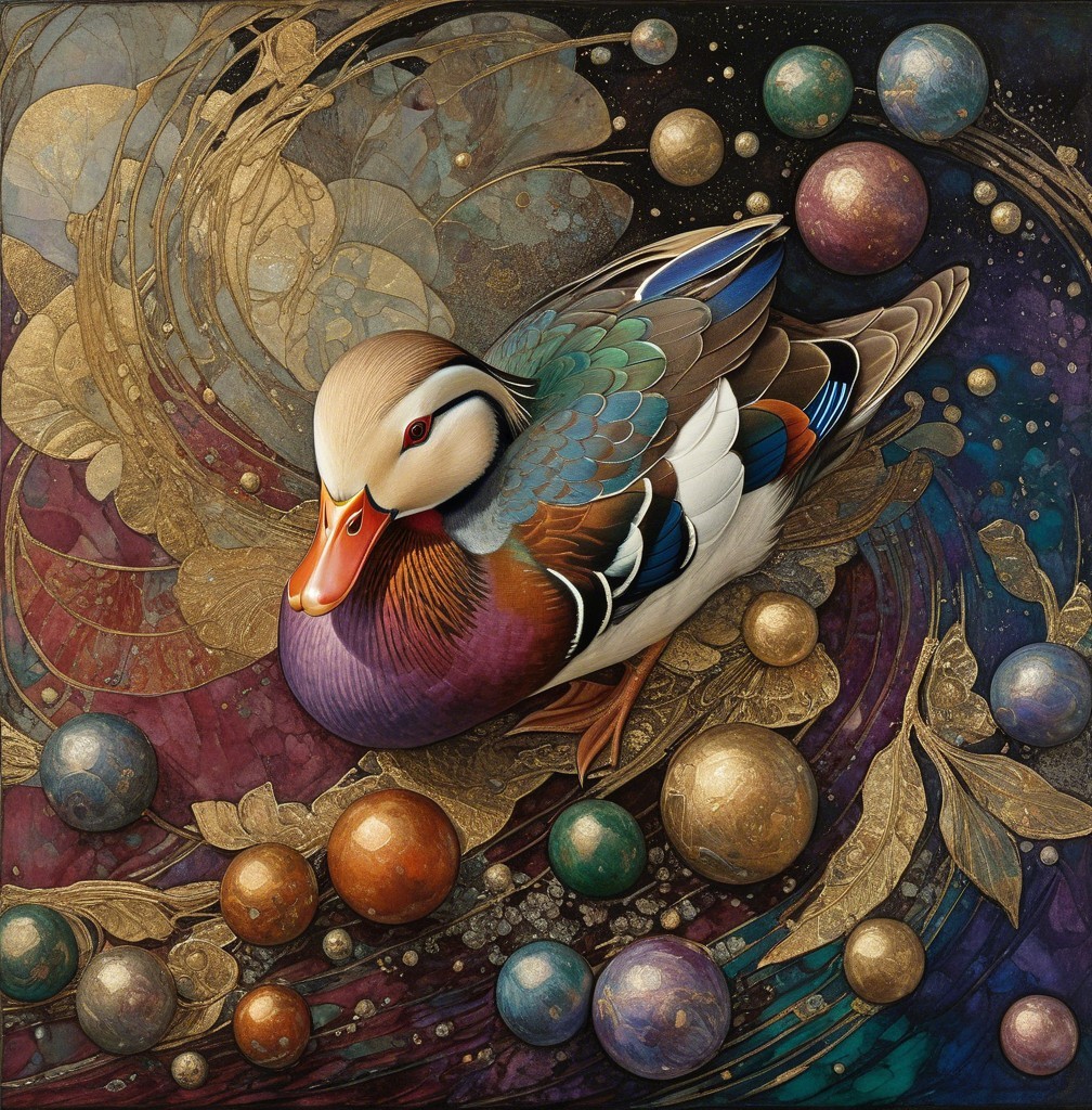A vividly colored mandarin duck stands gracefully against a swirling background, showcasing its intricate plumage of green, orange, and blue hues, reflecting its beauty and elegance.