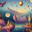 A surreal landscape with whimsical castles and floating orbs, featuring birds and butterflies. Soft pastel colors create a dreamlike atmosphere, merging fantasy with ethereal beauty.