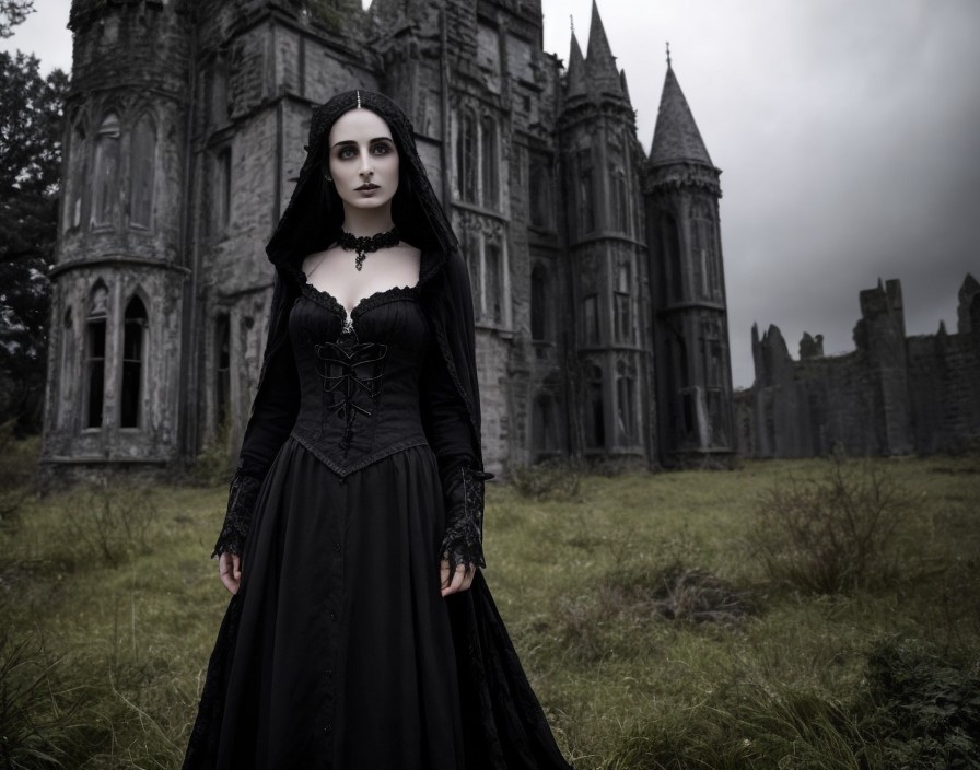 Gothic Attired Woman in Front of Eerie Castle