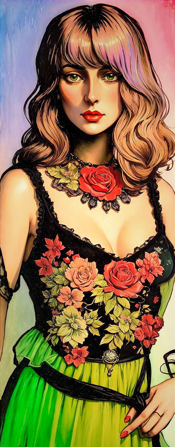Craquelure and linocut, Stylized Portraiture by Iren Horrors, Theophile Steinlen, Kees van Dongen, Marianne Stokes, Overton Loyd, Margaret Keane, beautiful teenage temptress with long crystalline hair and frilly shirt, iridescent, red and green tones, hues, chiaroscuro lighting in background, american gothic 1.7, watercolor and ink with hues, traumacore 1.9, beautiful composition 1.9, Stylized woodblock print, stylized line-art Portraiture, lineage patterns, dark green and muted red tones, (((hues, style by Overton Loyd, Iren Horrors, Theophile Steinlen, Kees van Dongen, Marianne Stokes, Edward Gorey, Margaret Keane, american gothic 1.9), Geometrical portrait of a woman with curly hairstyle) 8:5), lace-draped, realistic eyes, elaborated textures, highly textured, high-definition painting, tints of fantasy and surreal illustration, intricate details, graceful, modernist fashion photography, detailed beauty, delicate coloring, soft edges, back-lit,traumacore 1.4 , brightness 1.4, high coloring 1.7, geometrical illustrative style, Pastel colors of green auburn blue , crisp quality, vector 9:5, intricate stylized hairstyle, perfect smirk handsface, american gothic 1.7, dynamic lighting 1.7, 3d effects 1.8, ambient occlusion 1.2, anisotropic filtering 1.2, raytraced shadows 1.8, stylized lineage illustration, octane render illustration 1.5, geometrical features, aura with sepia glow,, limited pallet, zentangle method, dynamic lighting, inviting, very stylized illustration 1.8, soft rounded edges, quilling, folded paper style 1.9, high plasticity, spiritual essence, beautiful composition 1.9, luminosity, brightness 1.9, tints and linocut and comic book art, dreamy, etheral, otherworldly, abstract, grunge, coherent, fauvistic, golden ratio, tints of John Singer Sargent ,Maxfield Parrish, Tamara de Lempicka