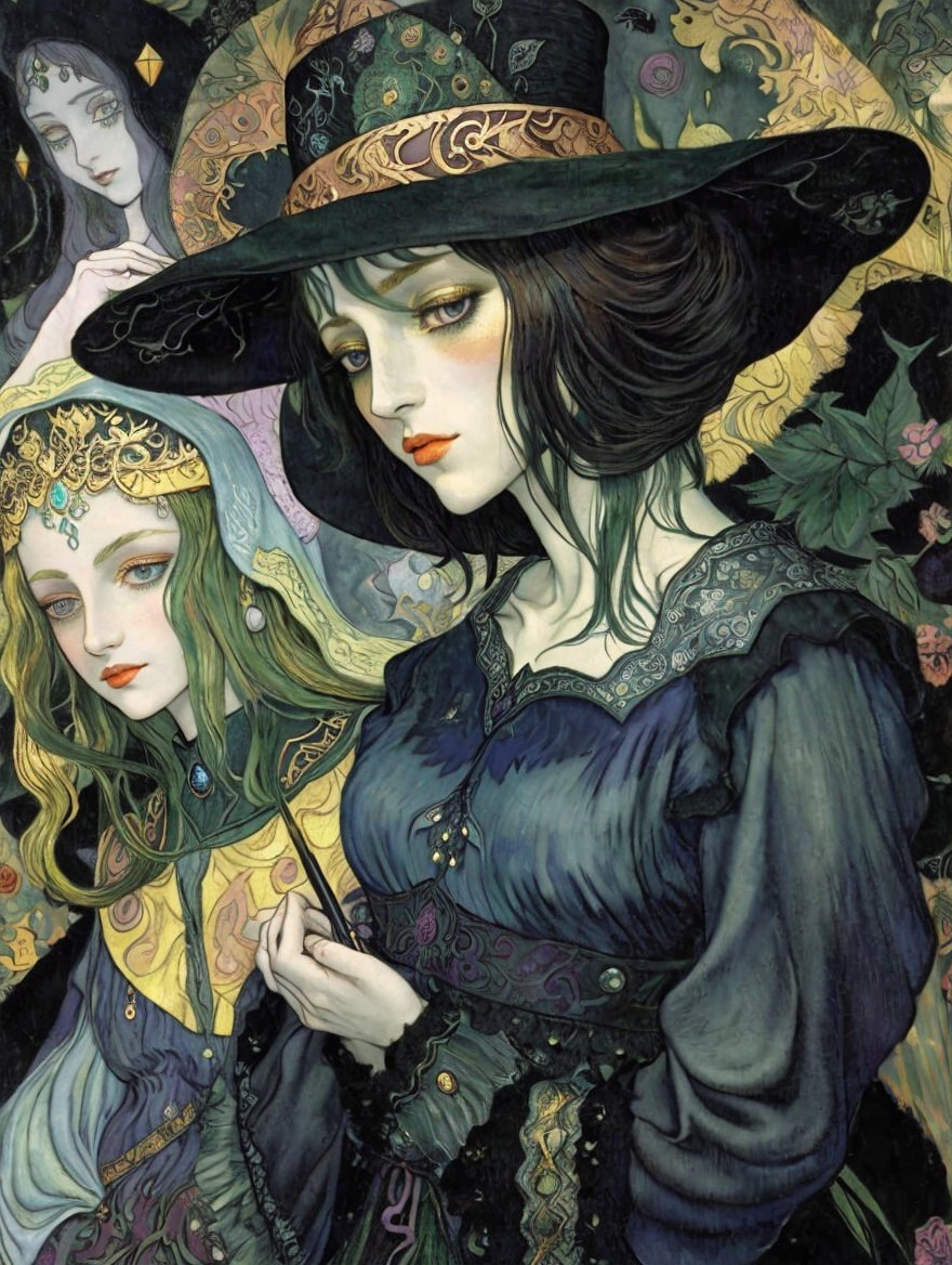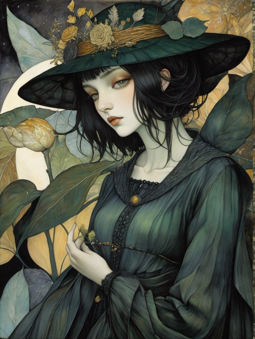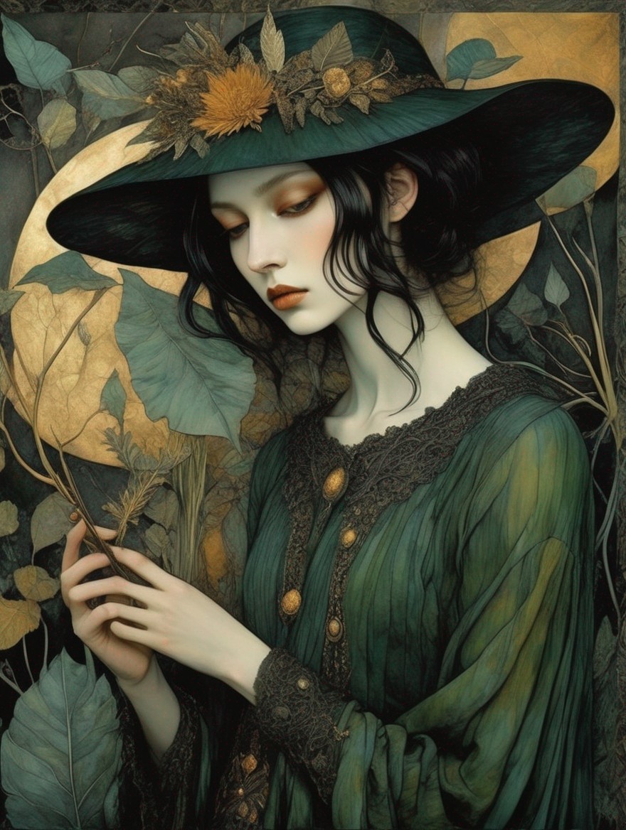A woman in a wide-brimmed hat, with a vintage green dress, poses with yellow flowers, conveying an elegant, ethereal aura.