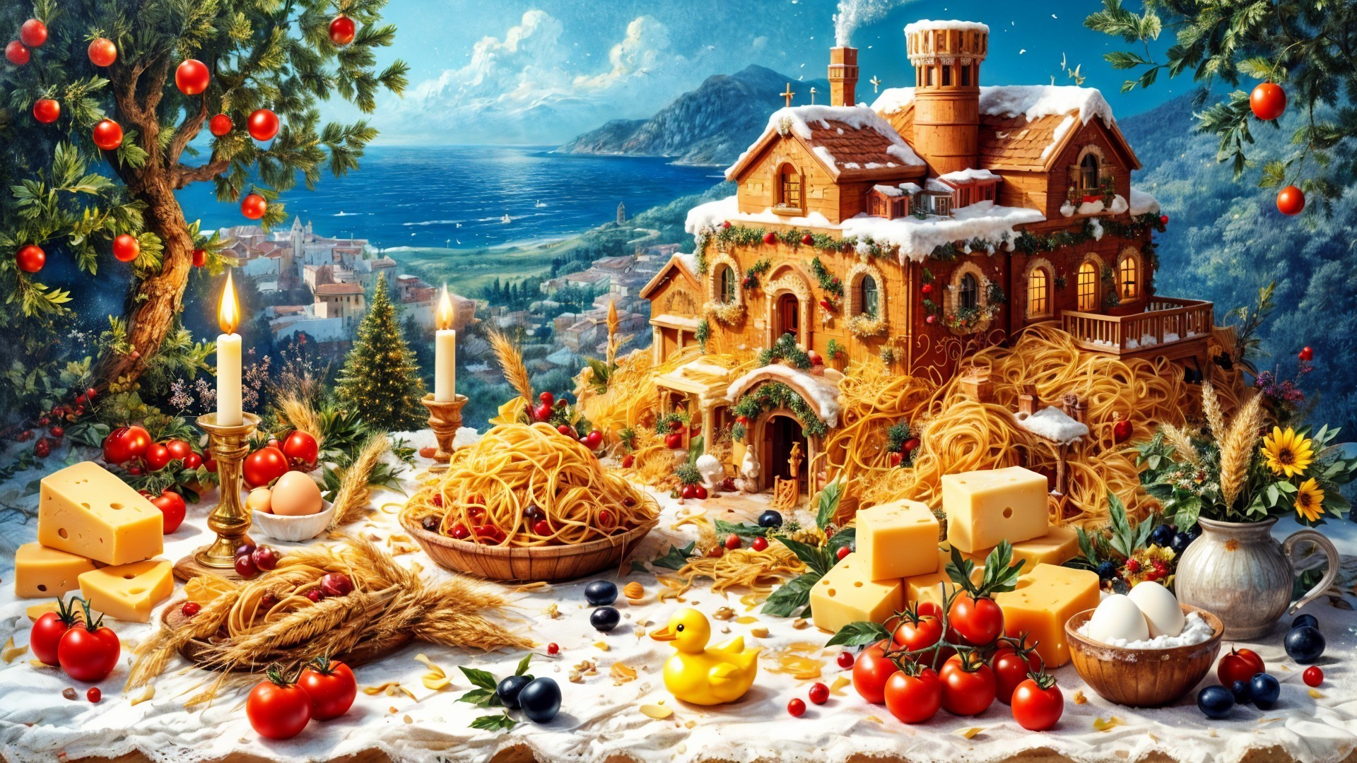 A whimsical scene features a pasta-themed house adorned with cheese, tomatoes, and eggs, set against a picturesque coastal backdrop. Candles cast a warm glow, enhancing the playful atmosphere.