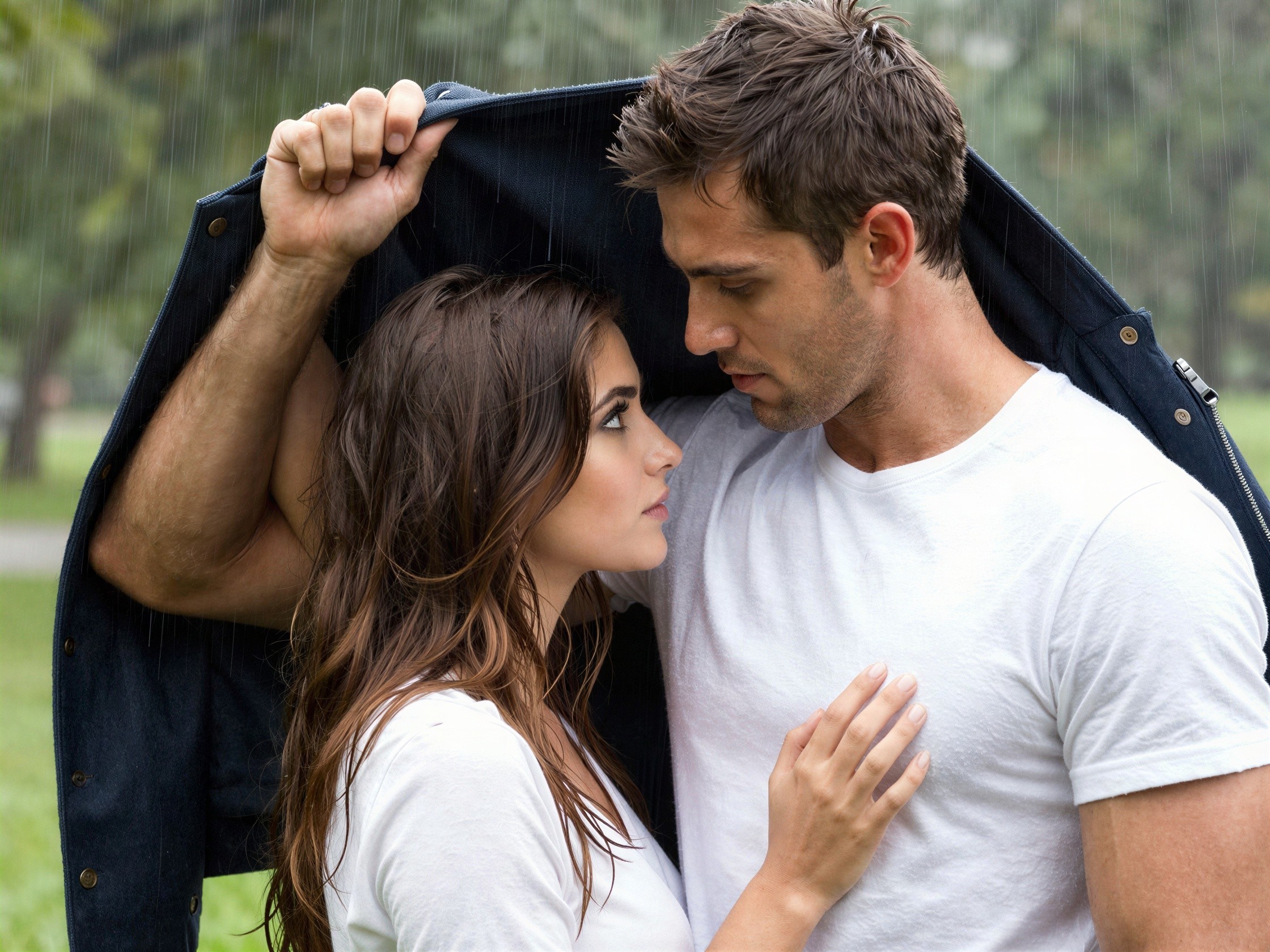 A young Caucasian couple with brown hair, both wearing white t-shirts, sharing a moment in the rain. The man holds up a dark blue denim-like jacket over their heads to shield them from the rain. He looks down at the woman, whose brown hair is slightly wet and wavy, and