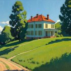 A vibrant paper-cut style illustration of a cozy yellow house with a red roof, surrounded by green hills, trees, and flowers. A winding path leads to the door, under a blue sky with clouds.