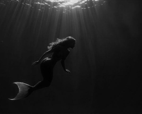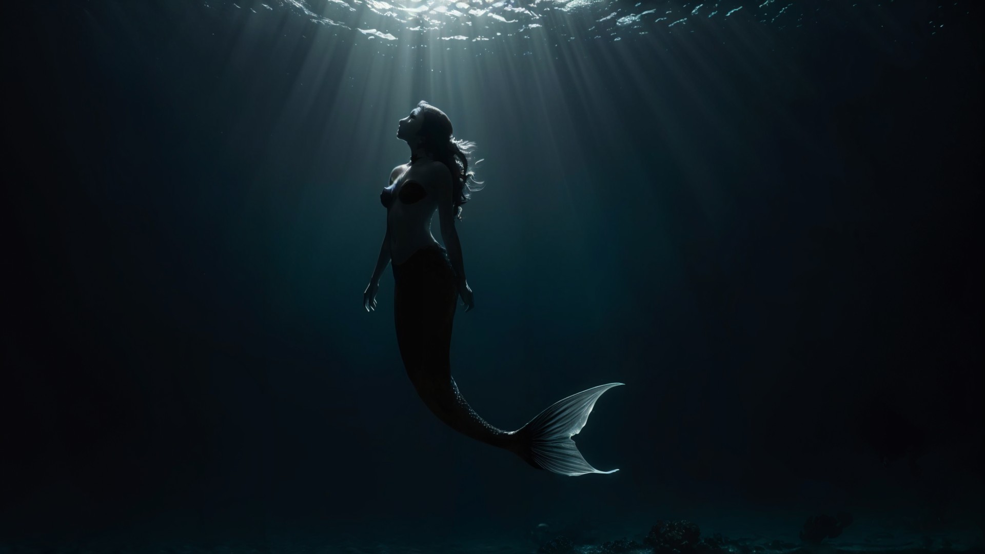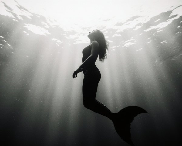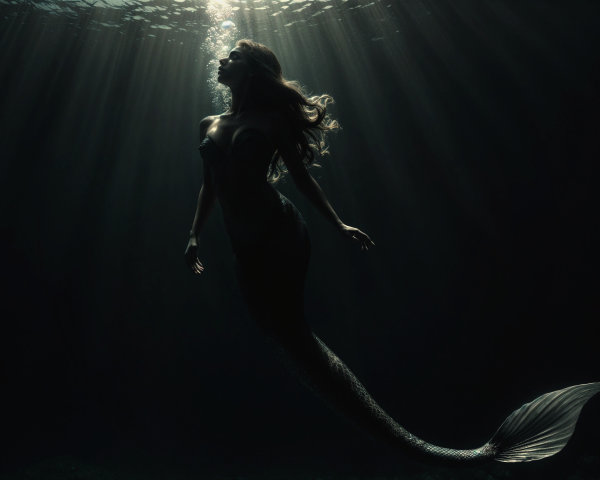 A mermaid gracefully swims in deep water, illuminated by beams of light piercing through the surface. Her shimmering tail contrasts against the dark, tranquil underwater scene.