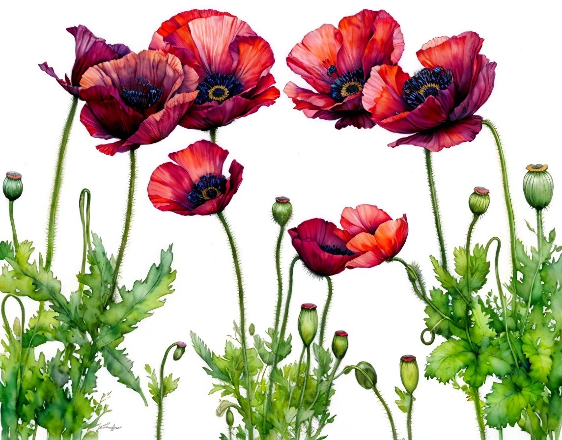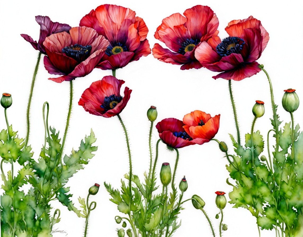 A vibrant watercolor painting of red poppies with green leaves and stems, showcasing detailed petals and unopened buds.