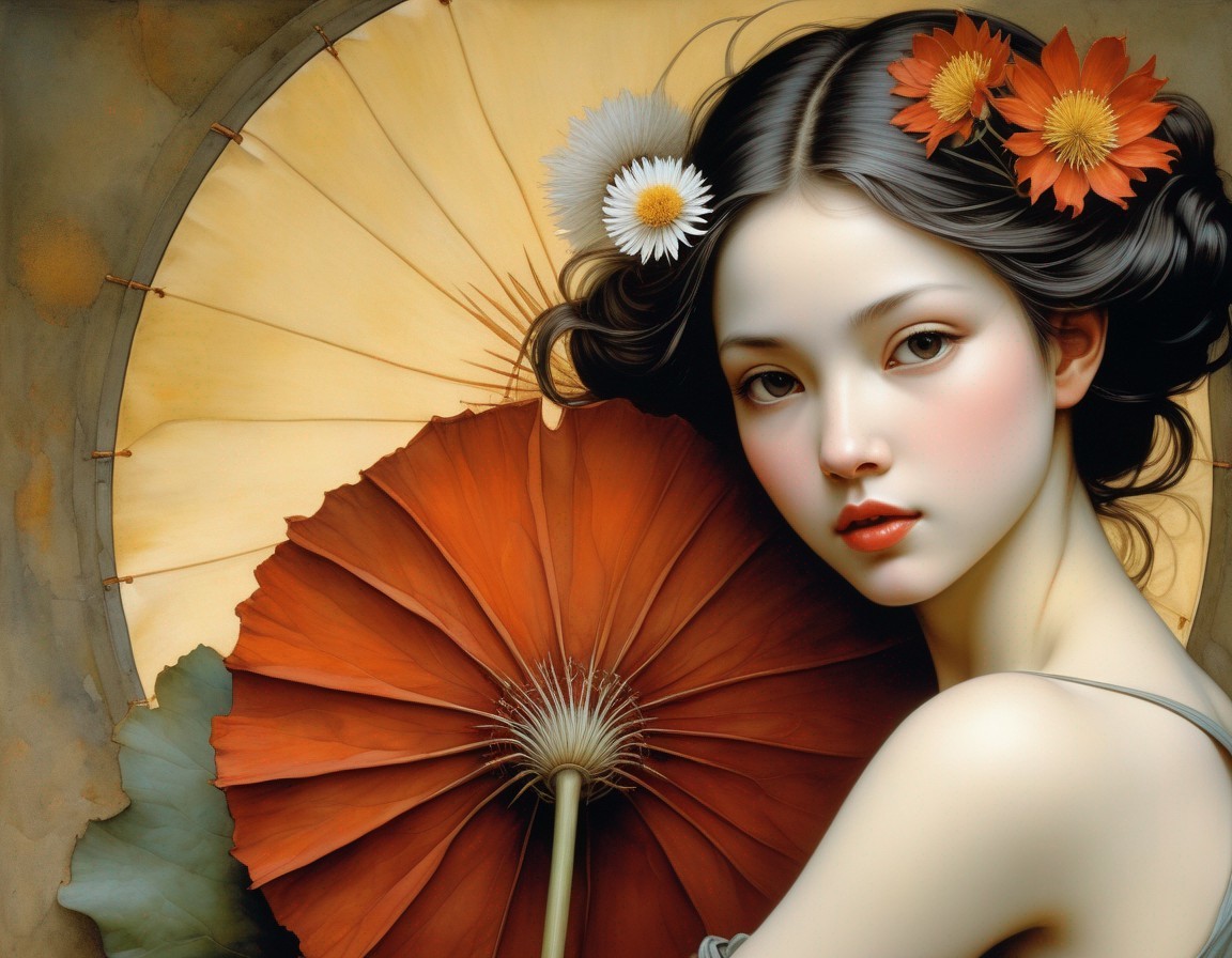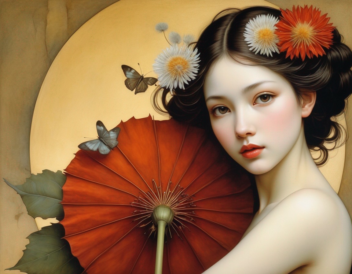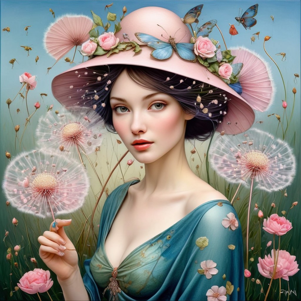A digital painting of a woman with a large pink hat adorned with flowers and dandelions, with a blue butterfly above her.