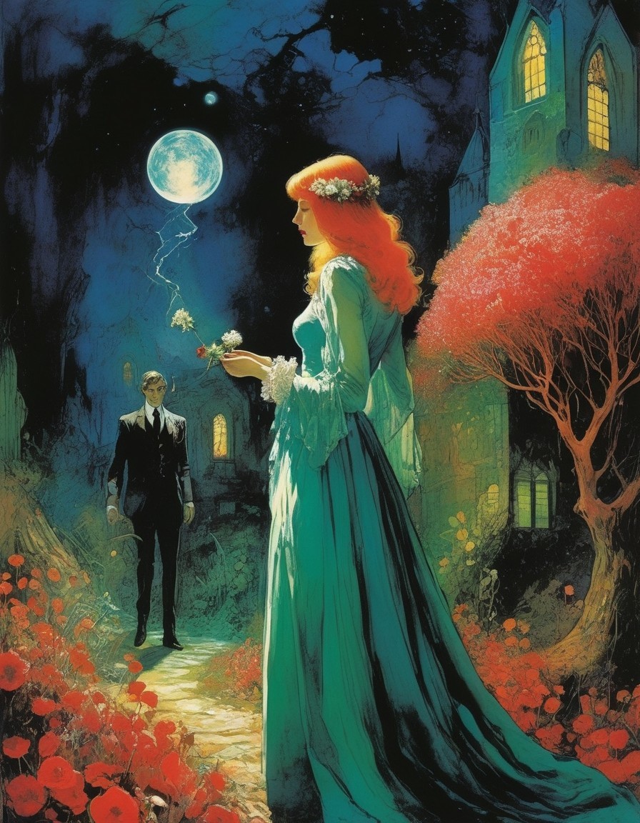 A woman in a green dress with a floral crown stands under a full moon, holding flowers, while a man in a suit looks on near a gothic building and red flowers.
