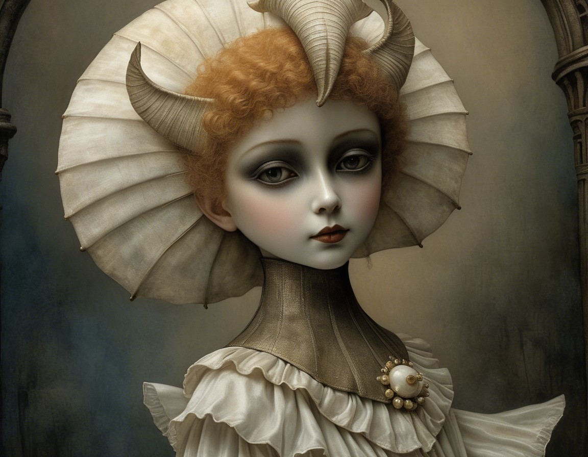 A stylized doll with vibrant curly red hair and striking features wears an elaborate white dress. Horns adorn her head, and a small doll sits atop her forehead, creating a whimsical, surreal aesthetic.