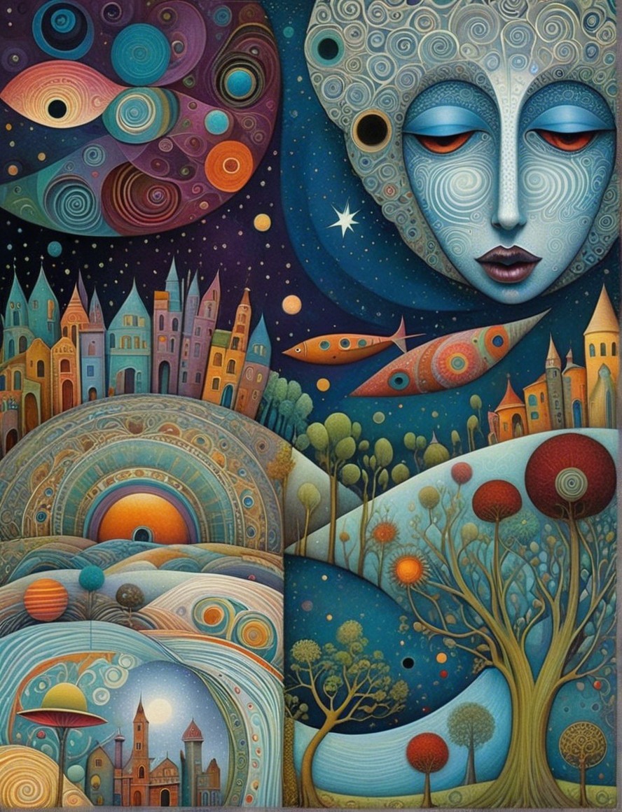 A surreal, colorful collage featuring a mysterious face with swirling patterns, set against a cosmic backdrop. Vibrant trees, whimsical architecture, and celestial elements create a dreamlike atmosphere.