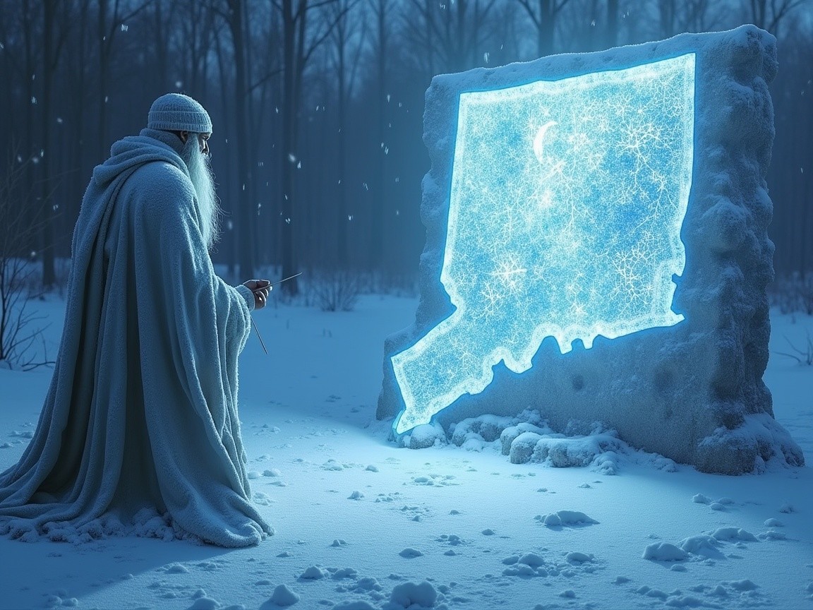 An Ice Wizard gazes intently at a shimmering, frozen map of Connecticut, intricate frost patterns highlighting its towns and landscapes, as he conjures magical plans for the icy realm ahead.