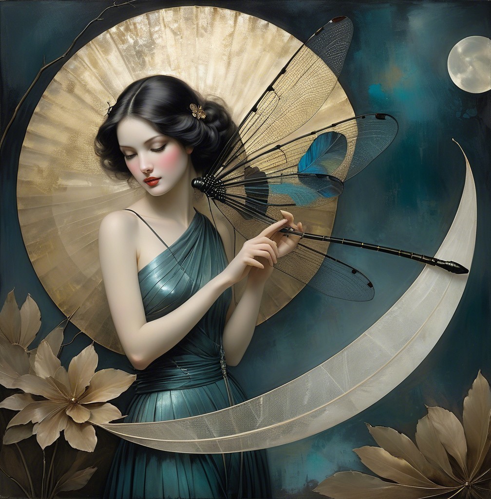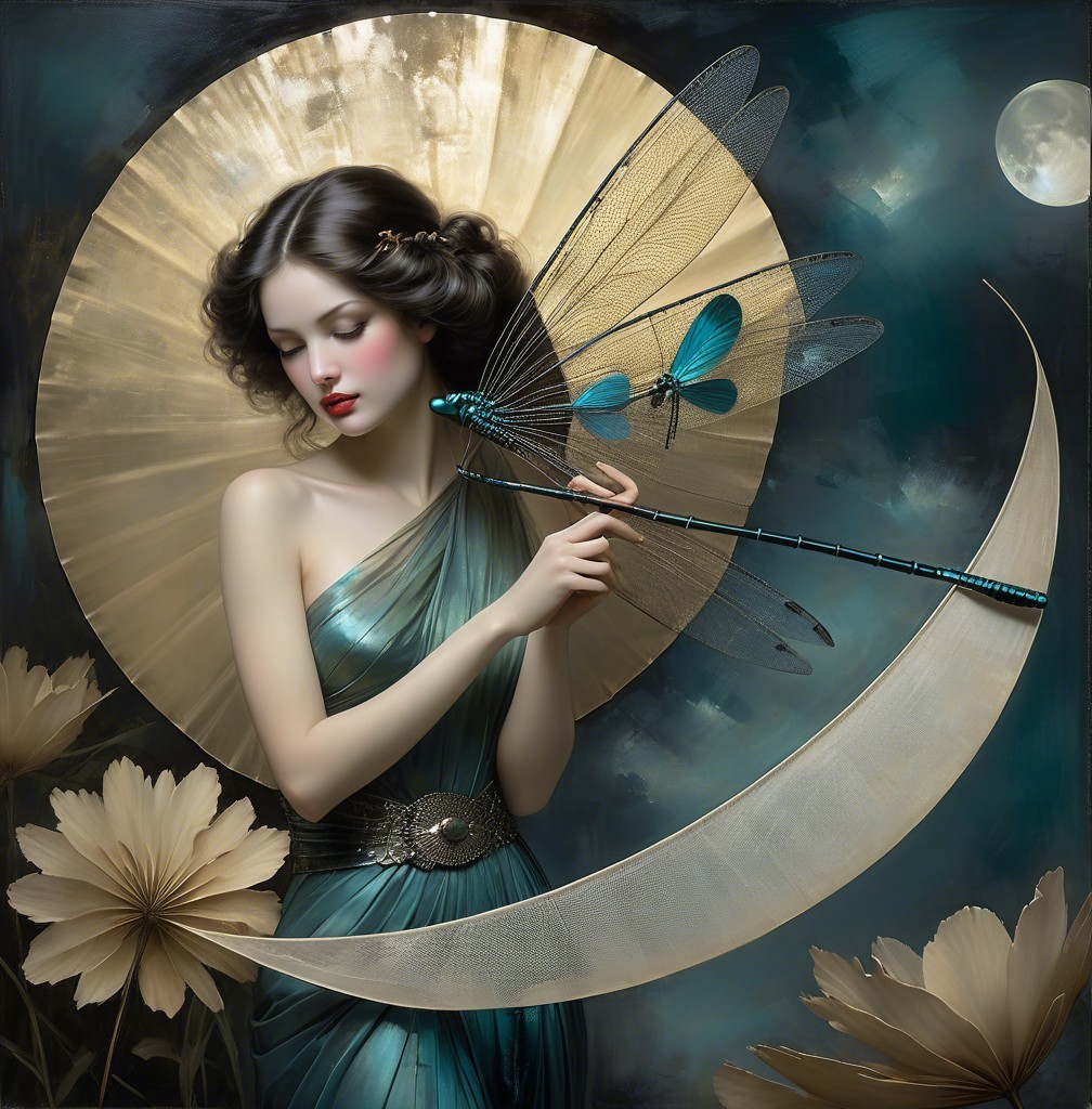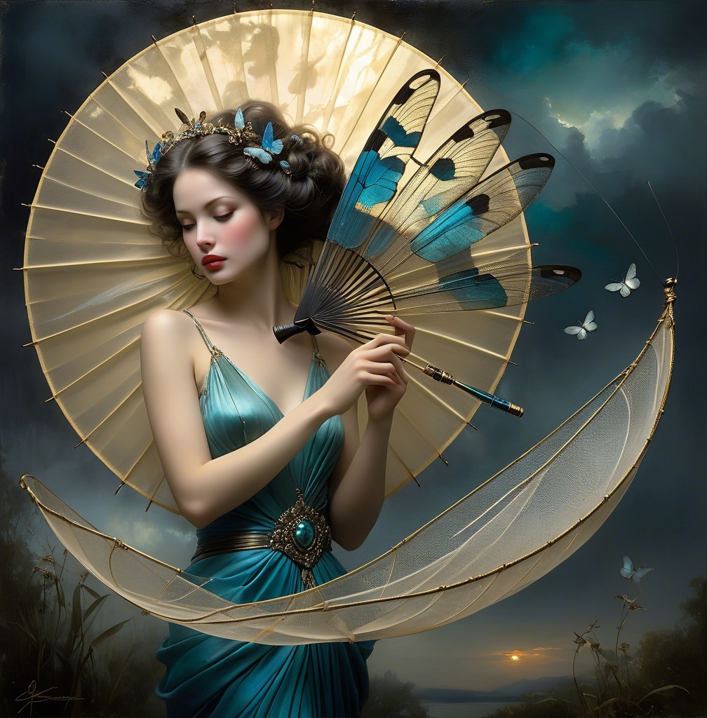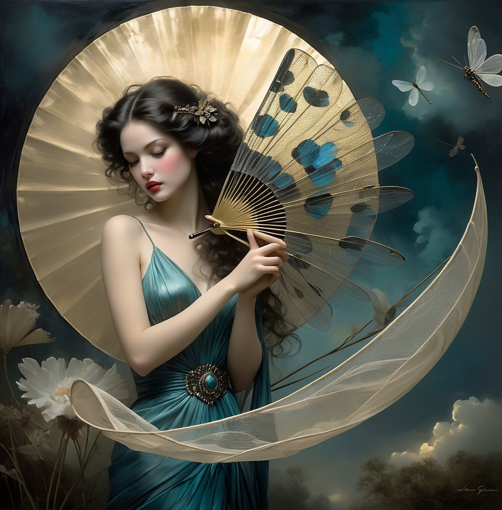 Prompt: beautiful woman holding a fan made from dragonflies. Mysterious woman Surreal dream in the style of pino daeni. Magical nostalgia, glory, Mercury Glass patina, light and gossamer haze, topographic lines, Art Brut, moody, somber, desaturated colors. In the style of John Rogers cox . This artwork amalgamates the artistic styles of Michael Parkes,