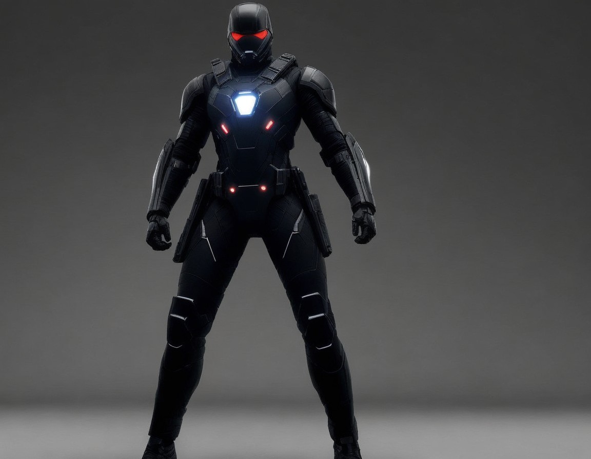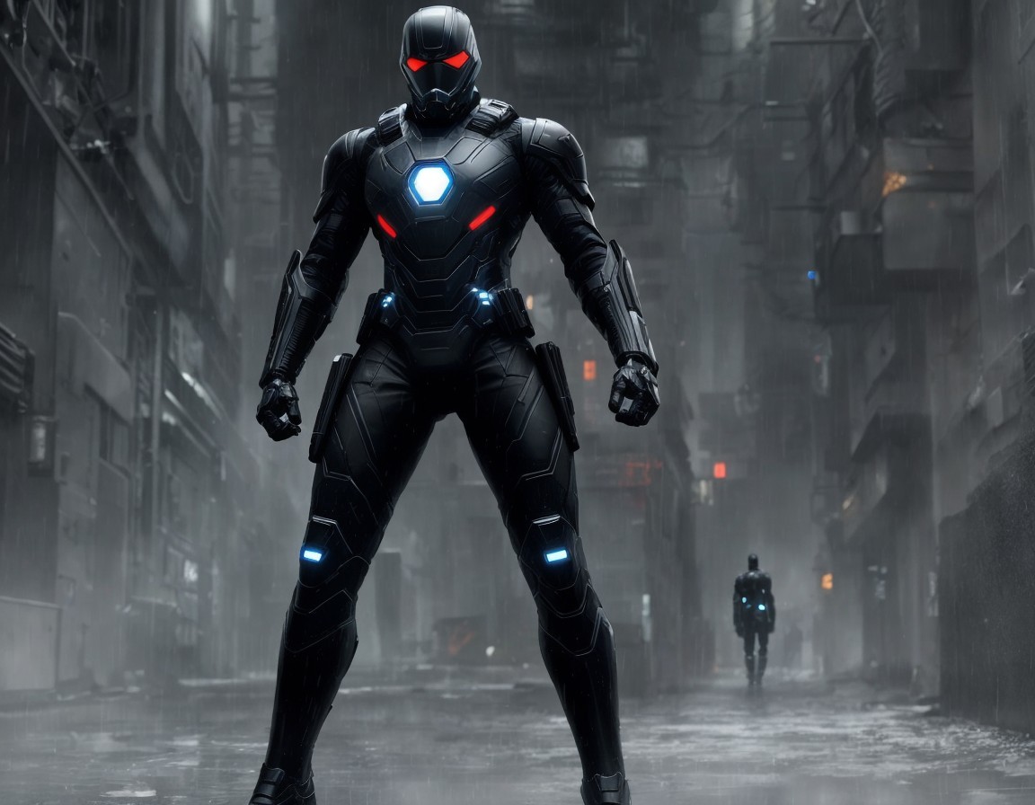 A person in a futuristic black suit with glowing blue lights stands powerfully on a rainy city street, another similar figure in the background.