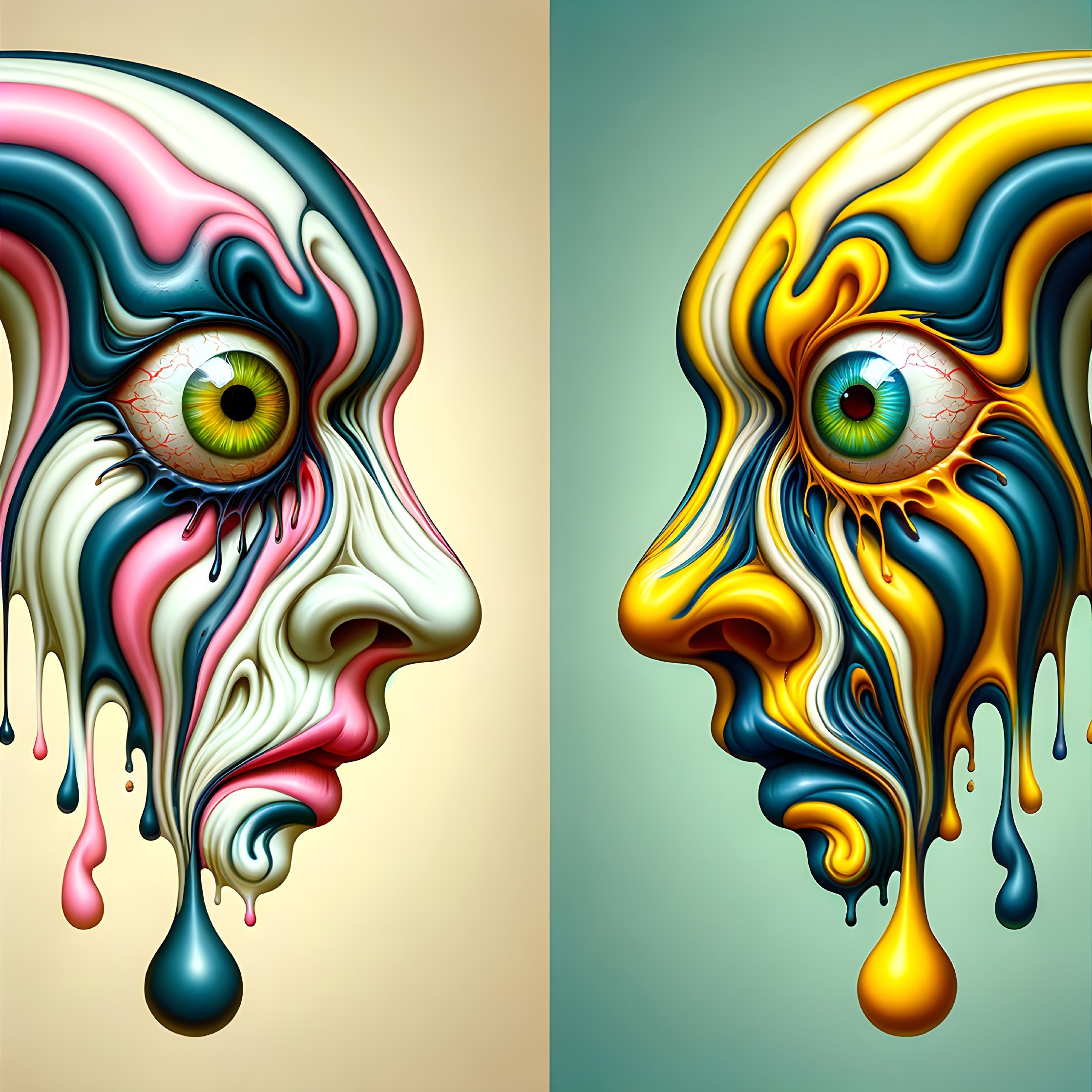 The image features two faces in profile, one in vibrant pink and blue with fluid patterns, and the other in yellow and blue. Both have large, expressive eyes, and colorful drips enhance the surreal effect.